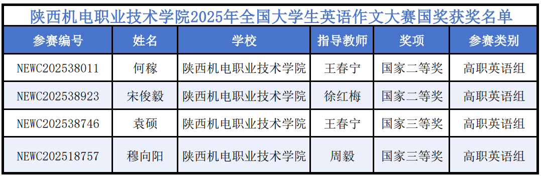近日,由高等学校大学外语教学研究会、全国高等师范院校外语教学与研究协作组联合主办的2025年全国大学生英语作文大赛获奖名单正式揭晓。我校学子在此次大赛中表现优异,共斩获国家级奖项4项、省级奖项30项,其中,国家级二等奖2项、三等奖2项,省级一等奖12项、二等奖11项、三等奖7项,获奖总数与层级均创历史新高。